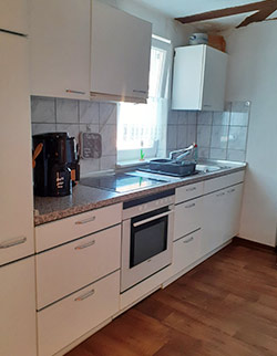 Die Küche ist komplett ausgestattet mit einer Esstischgruppe, Ceranfeld, Backofen, Kühlschrank, Kaffeemaschine, Toaster und Mikrowelle.